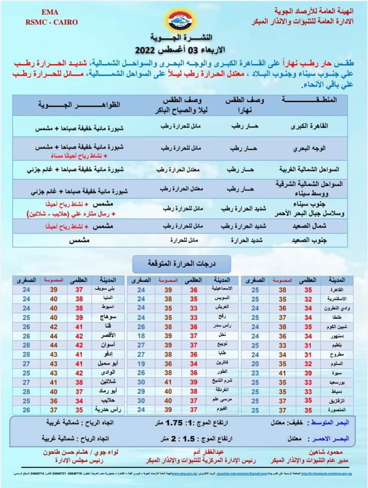 كشفت الهيئة العامة للأرصاد الجوية تفاصيل حالة الطقس اليوم الأربعاء، الموافق 3 أغسطس 2022، محذرة ارتفاع حركة الأمواج على بعض الشواطئ.
