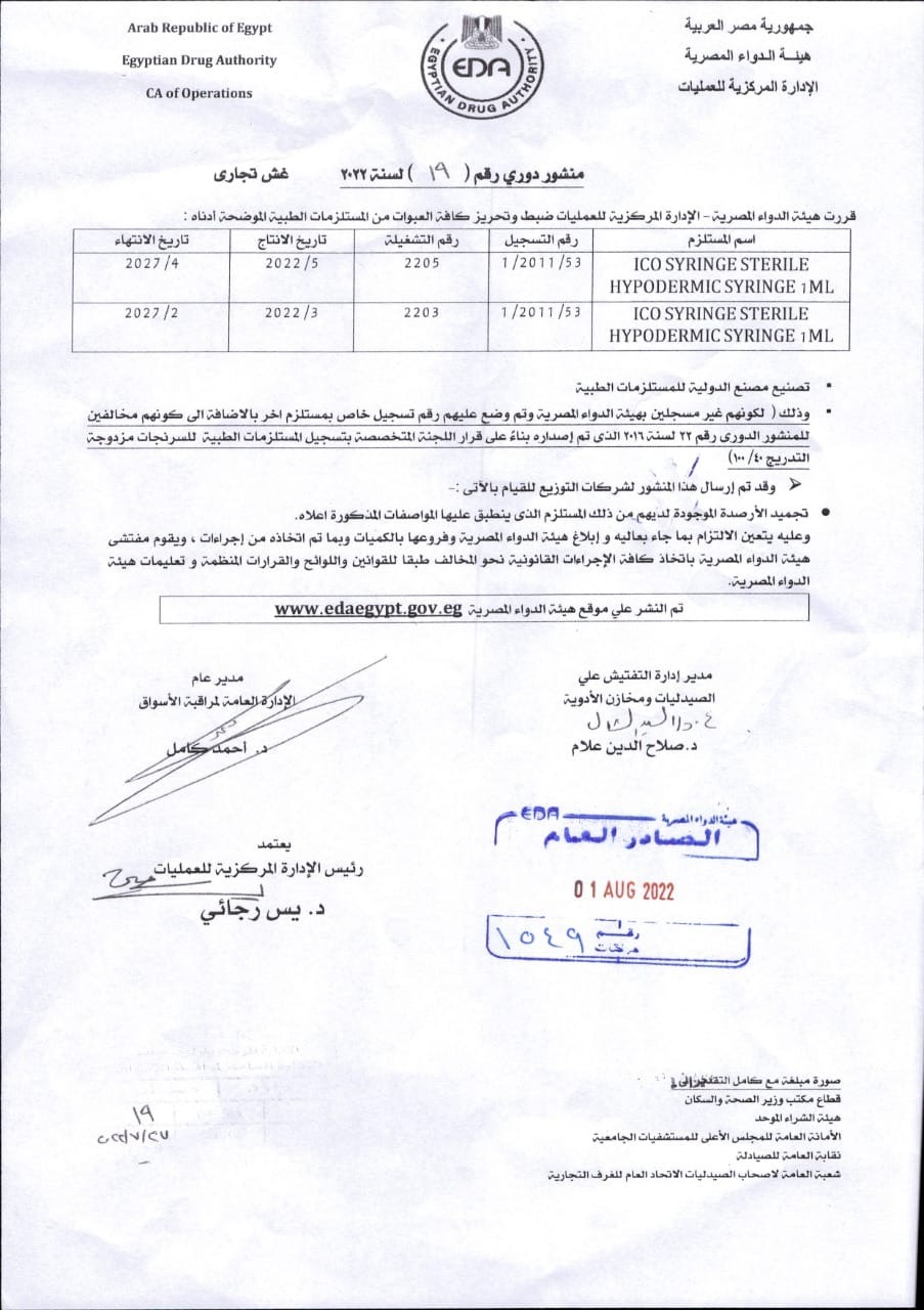 وأضافت هيئة الدواء المصرية، أن تلك التشغيلات من هذه الحقن، غير مسجلة، وتم وضع عليها رقم تسجيل خاص بمستلزم آخر، بالإضافة إلى كونها مخالفة للمنشور الدوري رقم 22 لسنة 2016، الذي تم إصداره بناء على قرار اللجنة المتخصصة بتسجيل المستلزمات الطبية للسرنجات مزدوجة.