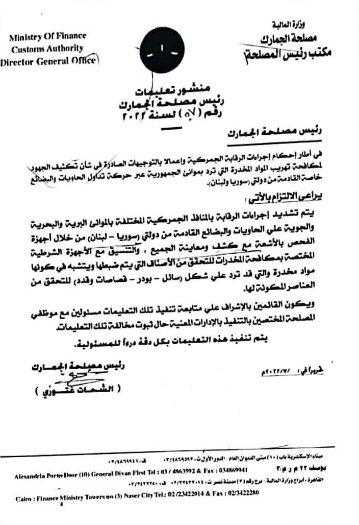 ونص مستند مصلحة الجمارك، على أنه في إطار إحكام إجراءات الرقابة الجمركية وإعمالا بالتوجيهات الصادرة في شأن تكثيف الجهود لمكافحة تهريب المواد المخدرة التي ترد بموانئ الجمهورية عبر حركة تداول الحاويات والمطالع خاصة القادمة من دولتي سوريا ولبنان.