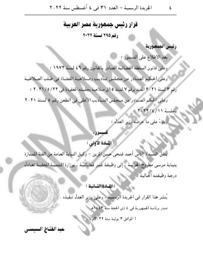 ونص القرار رقم 295 لسنة 2022، بأن ينقل إياس أحمد فتحي حسن المزين، وكيل النيابة العامة من الفئة الممتازة بنيابة مرسى مطروح الجزئية إلى وظيفة غير قضائية بـ وزارة التنمية المحلية تعادل درجة وظيفته الحالية.