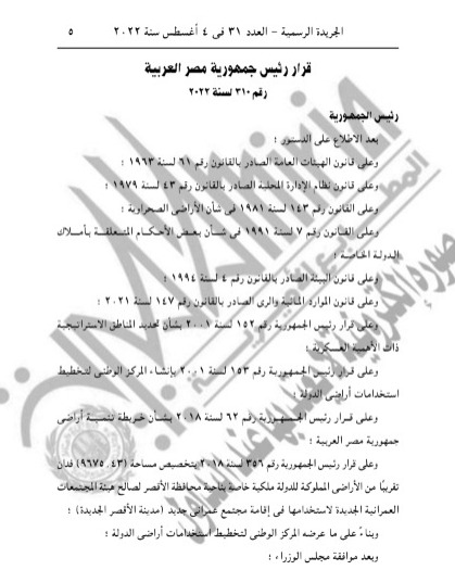 ونص القرار رقم 310 لسنة 2022، بأن تخصص مساحة 67.85 فدان تقريبًا تعادل 285032 م2 من الأراضي المملوكة للدولة ملكية خاصة ناحية مركز ومدينة الطود بـ محافظة الأقصر، وفقًا للوحة وجدول الإحداثيات المرفقين، لصالح محافظة الأقصر، لاستخدامها في إقامة محطة معالجة صرف صحي.