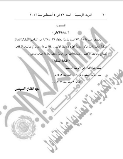 ونص القرار رقم 315 لسنة 2022، بأن تخصص مساحة 5.05 فدان تقريبًا تعادل 21236 مترًا مربعًا من الأراضي المملوكة للدولة ملكية خاصة ناحية محافظة سوهاج وفقًا للوحة وجدول الإحداثيات المرفقين لصالح وزارة التعليم العالي والبحث العلمي لاستخدامها في إقامة وحدة أبحاث علمية للطاقة المتجددة وذلك نقلا من الأراضي المخصصة للاستصلاح والاستزراع.