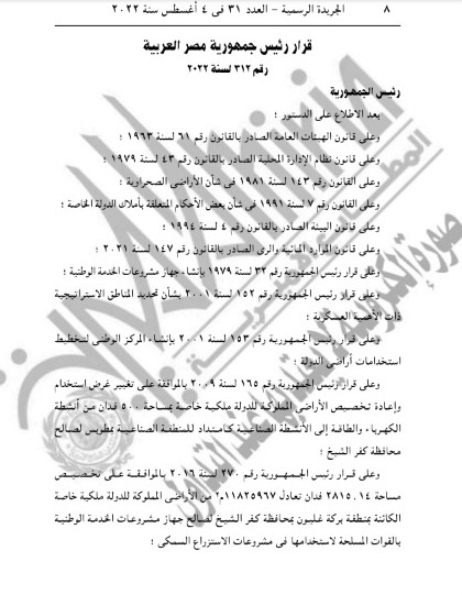 وتناول القرار رقم 313 لسنة 2022، بأن تخصص مساحات مبينة من الأراضي المملوكة للدولة ملكية خاصة، ناحية محافظة سوهاج، لاستخدامها في إقامة مشروعات ضمن المبادرة الرئاسية لتطوير قرى الريف المصري حياة كريمة.