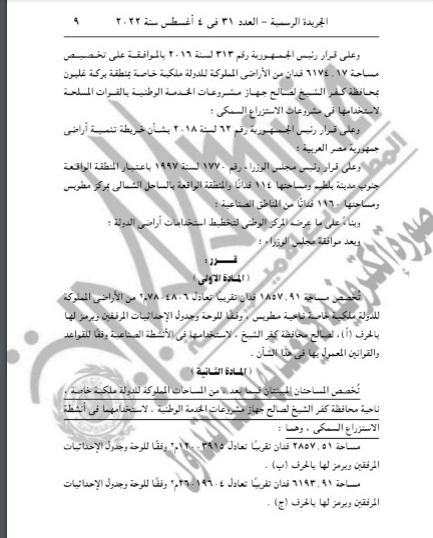 ونص القرار رقم 312 لسنة 2022، في مادته الأولى، بأن تخصص مساحة 1857.91 فدان تقريبًا تعادل 7804806 م2 من الأراضي المملوكة للدولة ملكية خاصة ناحية مطوبس، وفقًا للوحة وجداول الإحداثيات المرفقين ويرمز لها بالحرف (أ) لصالح محافظة كفر الشيخ، لاستخدامها في الأنشطة الصناعية وفقًا للقواعد والقوانين المعمول بها في هذا الشأن.