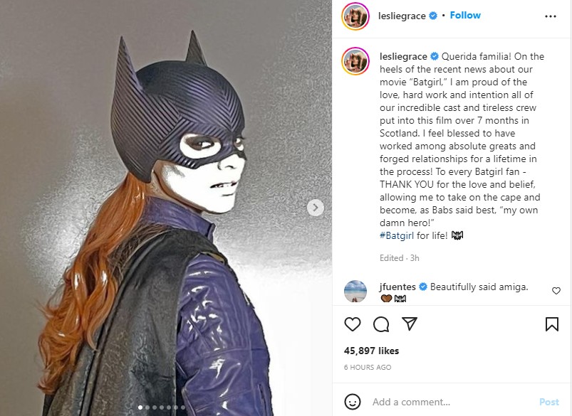 وأكدت ليزلي جريس، في تغريدة عبر حسابها الشخصي بـ انسجرام، سعادتها لـ مشاركة بـ فيلم Batgirl، قائلة: في أعقاب الأخبار الأخيرة حول فيلمنا Batgirl.. أنا فخورة بالحب والعمل الجاد والنية التي قدمها جميع الممثلين المذهلين، وطاقم العمل الذي عمل بكل جهد في هذا الفيلم على مدار 7 أشهر بـ اسكتلندا.