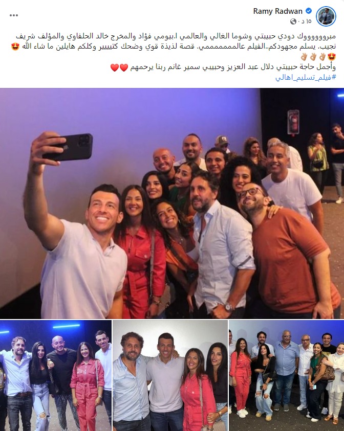 هنأ الإعلامي رامي رضوان، زوجته الفنانة دنيا سمير غانم، وجميع طاقم عمل فيلم تسليم أهالي، الذي تم عرضه أمس بجميع دور العرض في السينمات.