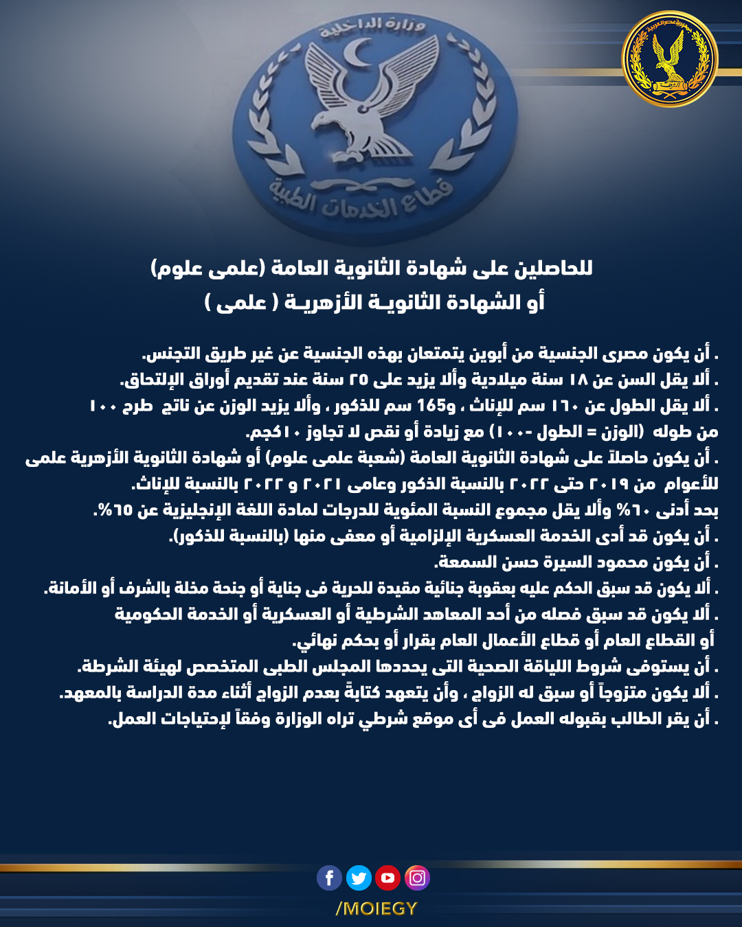 أعلنت وزارة الداخلية فتح باب التقدم بـ المعاهد الفنية الصحية الشرطية، للحاصلين على شهادة الثانوية العامة علمي علوم، والشهادة الثانوية الأزهرية علمي للأعوام من 2019 حتى 2022 للذكور، وعامي 2021 و2022 للإناث، بحد أدنى 60% على ألا يقل نسبة النجاح في اللغة الإنجليزية عن 65%.