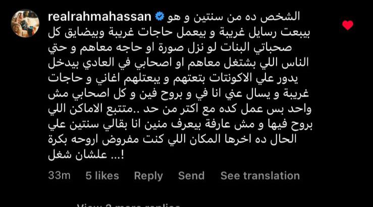 وكتبت رحمة حسن منشورًا عبر حسابها الشخصي بموقع انستجرام، إذ قالت: الشخص ده من سنتين وهو بيبعت رسايل غريبة وبيعمل حاجات غريبة وبيضايق كل صحباتي البنات، لو نزل صورة أو حاجة معاهم وحتى الناس اللي بشتغل معاهم أو أصحابي في العادي بيدخل يدورعلى الأكونتات بتعتهم ويبعتلهم أغاني وحاجات غريبة ويسأل عني أنا وبروح فين.