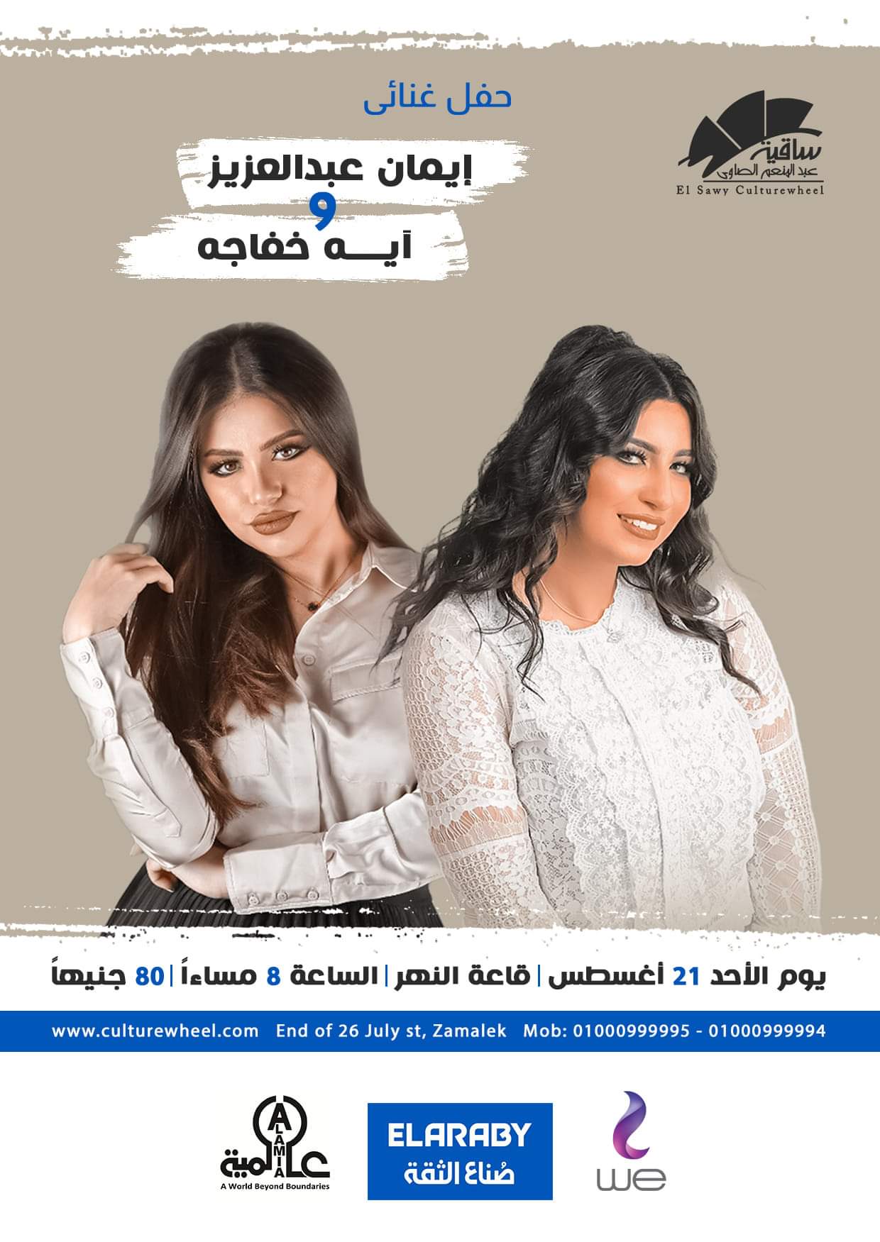 تستعد المطربة إيمان عبد العزيز، والمطربة آية خفاجة، لإحياء حفل في ساقية الصاوي، وذلك يوم الأحد الموافق 21 أغسطس الجاري.