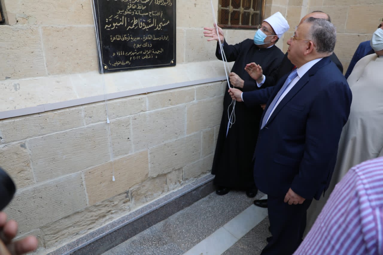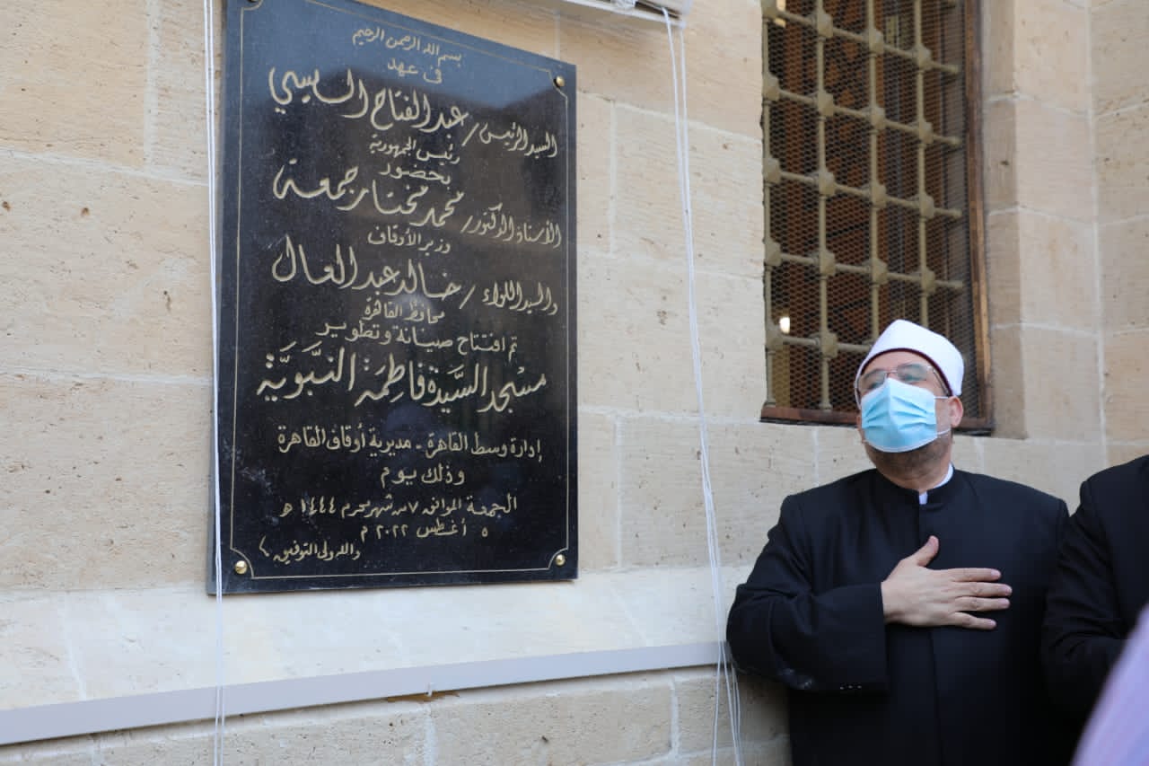 افتتح الدكتور محمد مختار جمعة، وزير الأوقاف، ورئيس المجلس الأعلى للشؤون الإسلامية، مسجد السيدة فاطمة النبوية، حفيدة رسول الله صلى الله عليه وسلم، بحي الدرب الأحمر بالقاهرة، وذلك عقب انتهاء أعمال الصيانة والترميم بالمسجد، بالتعاون مع مؤسسة مساجد.