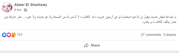 وكتبت عبير الشرقاوي، منشورًا عبر حسابها الشخصي بموقع فيسبوك، قائلة: يا جماعة مفيش حديث بيقول إن الدعوة تستجاب لو في أربعين غريب دعا، الكلام ده لا أساس له من الصحة ولا هو حديث ولا غيره، مش عارفة مين جبار بيألف الكلام ده وينشره.