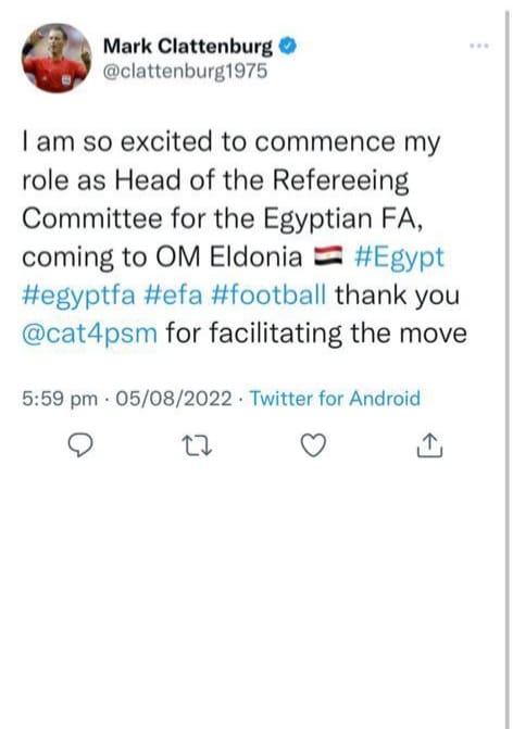 وكتب مارك كلاتنبرج، عبر حسابه على تويتر: أنا متحمس جدا لتولي مهمتي برئاسة لجنة التحكيم في الاتحاد المصري لكرة القدم.. أنا قادم يا أم الدنيا.