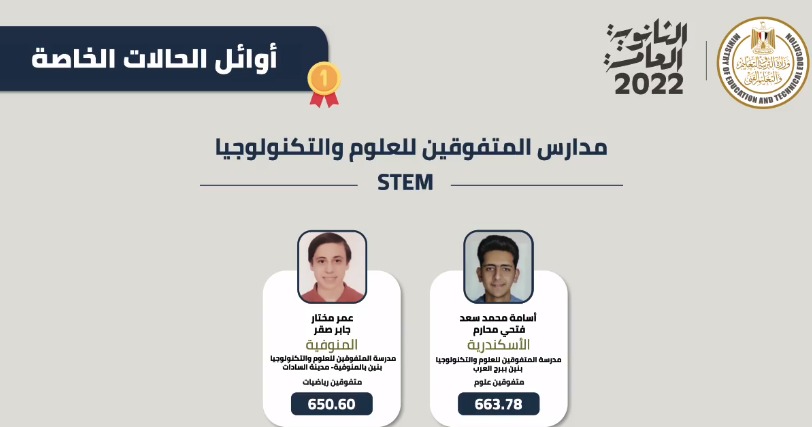 أسماء أوائل الثانوية العامة 2022 لطلاب مدارس المتفوقين