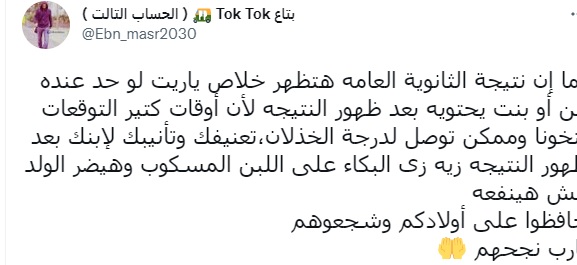 كتب مغرد: ياريت لو حد عنده ابن أو بنت يحتويه بعد ظهور النتيجة، لأن أوقات كتير التوقعات بتخونا وممكن توصل لدرجة الخذلان، تعنيفك وتأنيبك لابنك بعد ظهور النتيجة زيه زى البكاء على اللبن المسكوب، وهيضر الولد مش هينفعه حافظوا على أولادكم وشجعوهم.