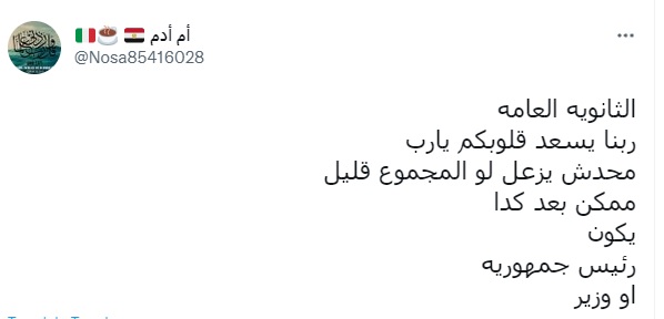 وقالت أم آدم: طلاب الثانوية العامة، ربنا يسعد قلوبكم يا رب، محدش يزعل لو المجموع قليل ممكن بعد كدة يكون رئيس جمهوريه أو وزير، وتفاعلت فتاة أخرى مع الهاشتاج فقالت: طلاب الثانوية العامة وأهاليهم: أحسنوا استقبال قدر الله واختياره؛ فالدنيا مليئة بسعداء وعظماء ليسوا مهندسين ولا أطباء.