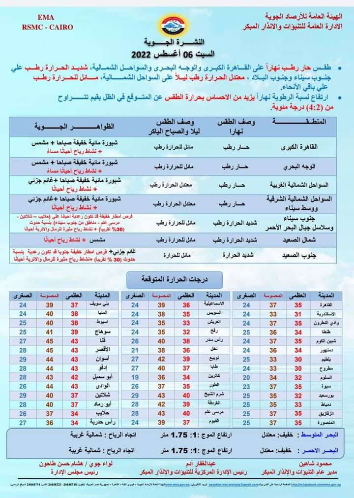 وقالت هيئة الأرصاد في بيان: تشهد القاهرة الكبرى والوجه البحري، والسواحل الشمالية، طقسًا حارا رطب، اليوم السبت، بينما يكون شديد الحرارة رطب على جنوب سيناء وجنوب البلاد خلال النهار.