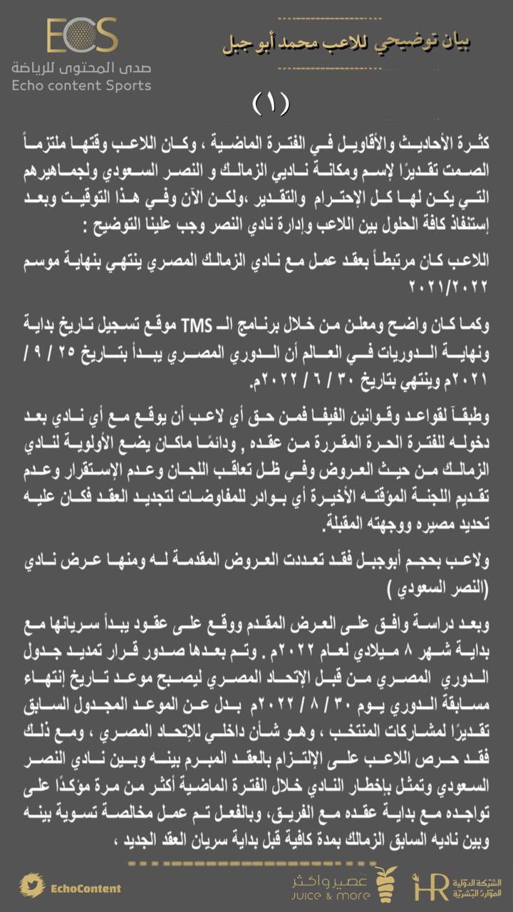أصدر محمد أبو جبل، لاعب نادي الزمالك السابق، بيانًا رسميًا يوضح فيه موقفه مع نادي النصر السعودي، الذي وقّع على عقود الانضمام إليه في وقت سابق.
