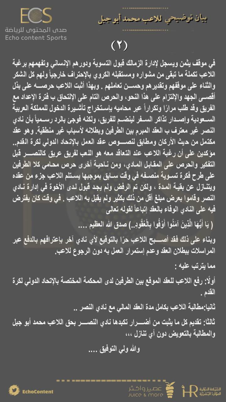 وأكد أبو جبل، في البيان، أنه سيطالب بالتعويض عن الأضرار التي تكبدها بسبب إدارة النصر، مؤكدًا أنه لن يتنازل.