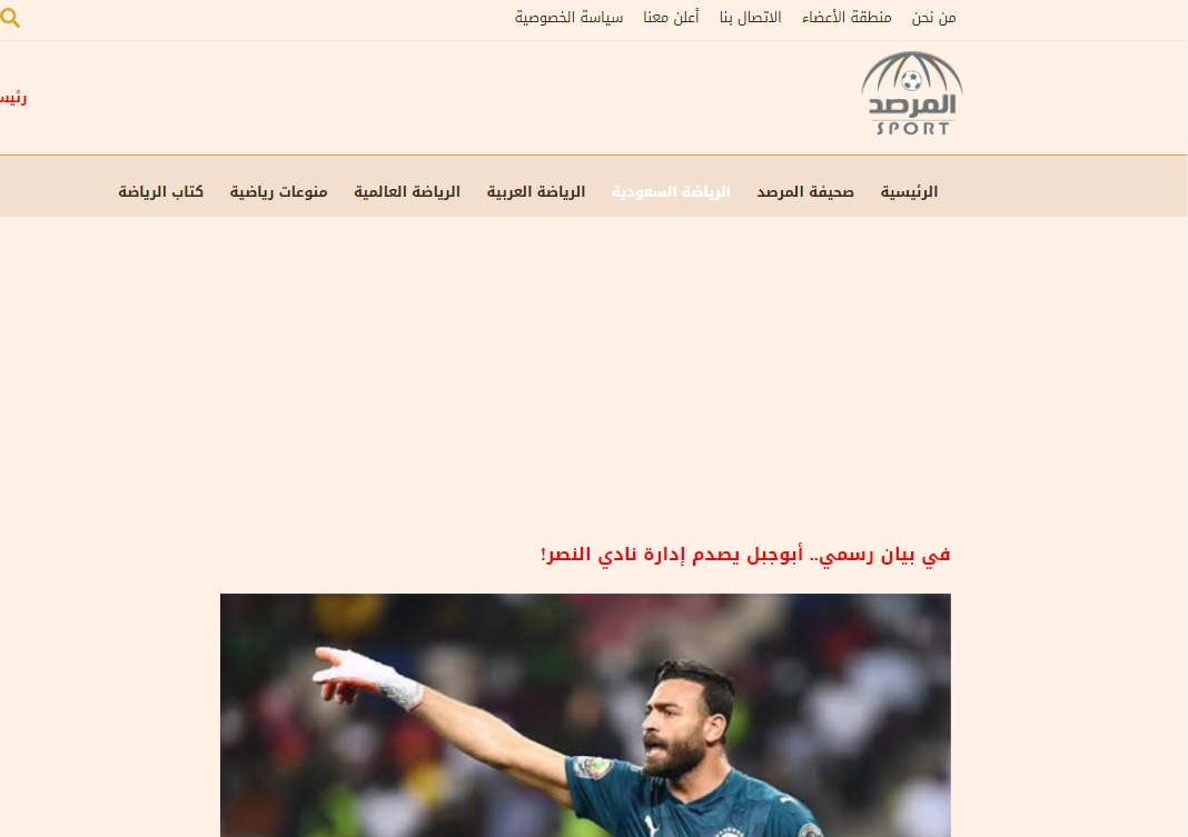 عنوان المرصد في بيان رسمي.. أبوجبل يصدم إدارة نادي النصر، حيث قالت أن رد فعل أبو جبل يمثل صدمة للنادي العالمي.