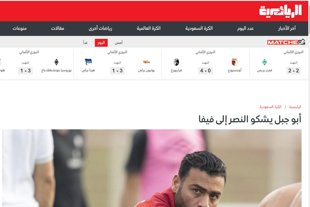 تصدر العنوان أبو جبل يشكو النصر إلى فيفا، صحيفة الرياضية السعودية، حيث أشارت إلى أن هناك أزمة سوف تنتظر نادي النصر بسبب الحارس المصري.