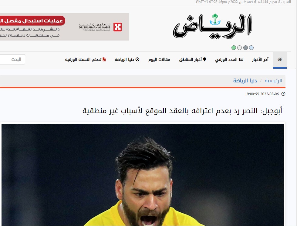 عنوان الرياض بـ أبوجبل: النصر رد بعدم اعترافه بالعقد الموقع لأسباب غير منطقية، وذلك في ظل رصدها للبيان الخاص باللاعب ضد النصر.