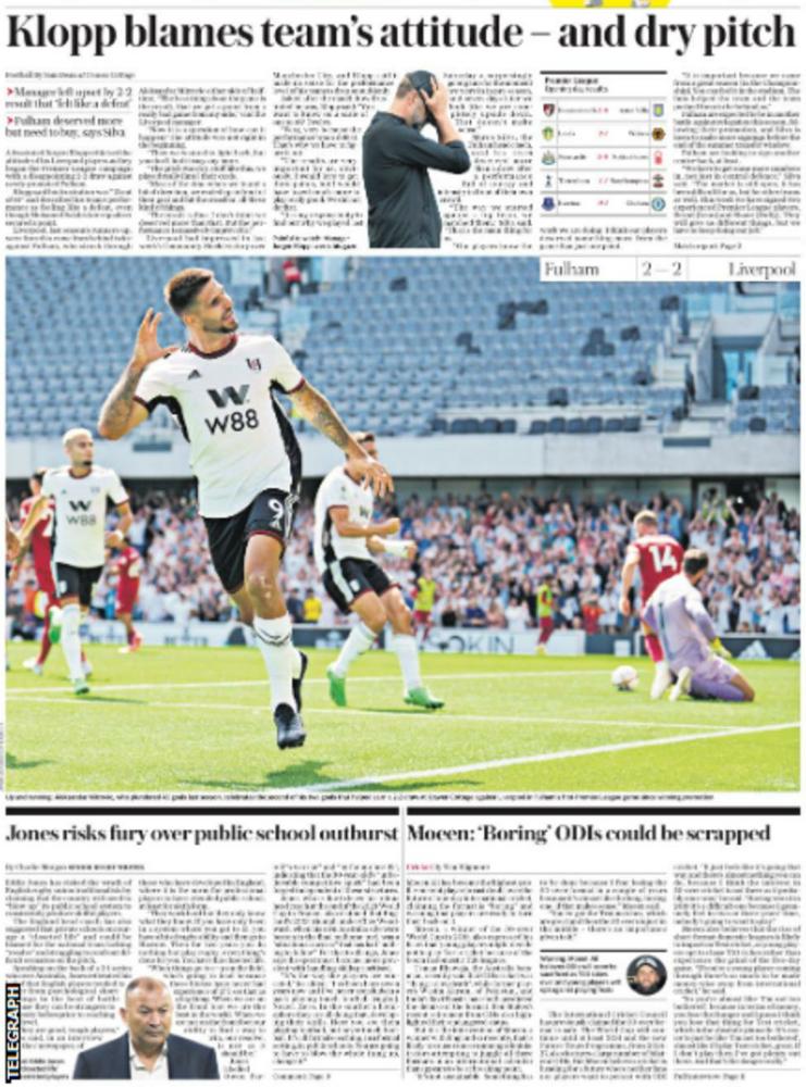 سلطت تيليجراف الضوء على تعادل ليفربول أمس في الجولة الأولى من مسابقة الدوري الإنجليزي مع فريق فولهام، حيث قالت إن كلوب يلوم لاعبيه بعد الأداء السيء، مع تألق الصربي ميتروفيتش الذي صعب المهمة على الريدز.