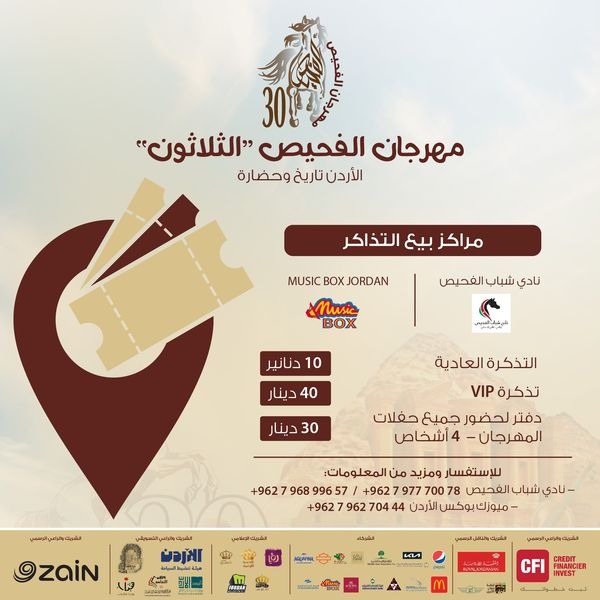تتنوع أسعار تذاكر حفلات مهرجان الفحيص بدورته الثلاثين، بين ثلاث فئات، الأولى بـ 10 دنانير، والثانية VIP بـو40 دينار، والثالثة دفتر لحضور جنيه حفلات 4 أشخاص بـ 30 دينار.