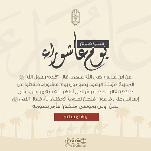 ونشرت صفحة الأزهر الشريف، عبر حسابها على موقع التواصل الاجتماعي فيس بوك، منشورا قالت فيه: يوم العاشر من شهر الله المحرَّم من الأيام العظيمة التي حثَّنا النبي صلى الله عليه وسلم على صيامها؛ شكرًا لله تعالى على أن نجَّى الله فيه سيدنا موسى عليه السلام، وأغرق فرعون وجنوده.