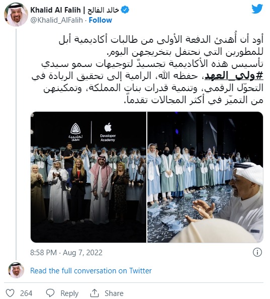 وأشار وزير الاستثمار السعودي، إن الاتفاق مع الشركة الأميركية تم خلال زيارة ولي العهد السعودي الأمير محمد بن سلمان لولاية كاليفورنيا ومقابلة تيم كوك في عام 2018.