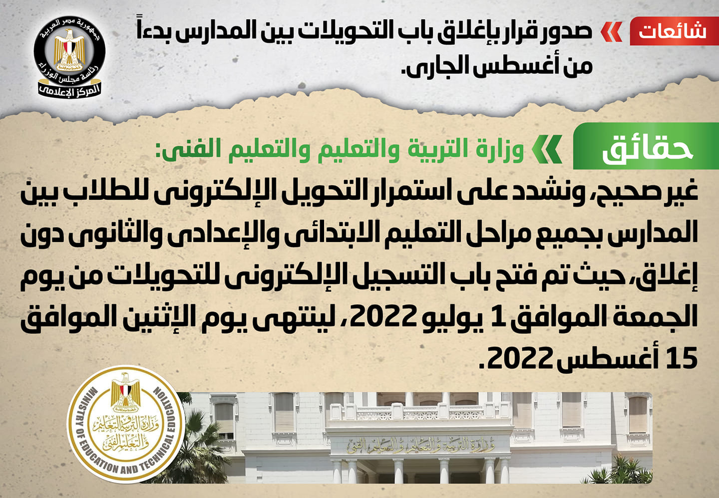 وتواصل المركز الإعلامي لمجلس الوزراء، مع وزارة التربية والتعليم والتعليم الفني، والتي نفت تلك الأنباء، مُؤكدةً أنه لا صحة لإغلاق باب التحويلات بين المدارس بدءا من شهر أغسطس الجاري، مُشددةً على استمرار التحويل الإلكتروني للطلاب بين المدارس بجميع مراحل التعليم الابتدائي والإعدادي والثانوي دون إغلاق، حيث تم فتح باب التسجيل الإلكتروني للتحويلات من يوم الجمعة الموافق 1 يوليو 2022، لينتهي يوم الإثنين الموافق 15 أغسطس 2022.