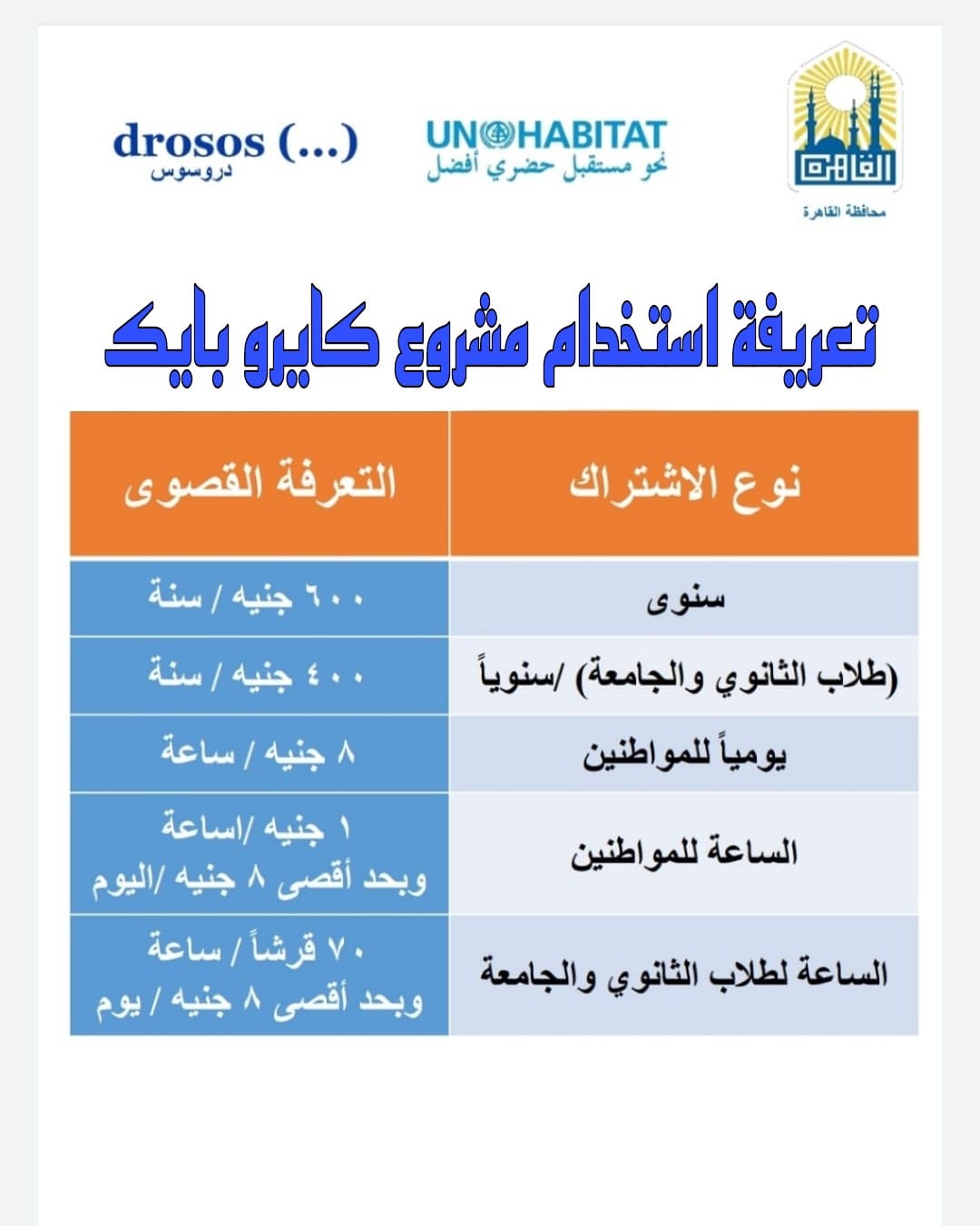 وأشار محافظ القاهرة، إلى أن قيمة التعريفة للمواطنين ستكون جنيه واحد في الساعة، وبحد أقصى 8 جنيهات في اليوم، وتبلغ قيمة الساعة لطلاب الثانوي والجامعة 70 قرشا للساعة وبحد أقصى 8 جنيهات في اليوم، وسعر الاشتراك سيكون 600 جنيه سنويًا، وسيتم تخفيضه لـ 400 جنيه لطلاب الثانوي والجامعة.