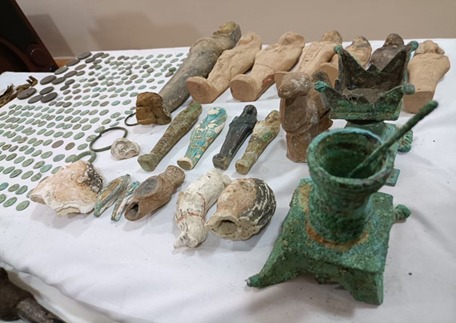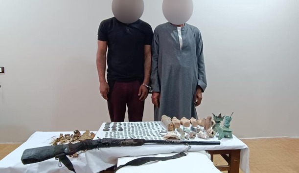 عقب تقنين الإجراءات بالتنسيق مع قطاع الأمن العام وبالاشتراك مع مديرية أمن المنيا تم استهدافهما وأمكن ضبطهما وعُثر بحوزتهما على عدد 292 قطعة يشتبه في أثريتها، بندقية خرطوش.