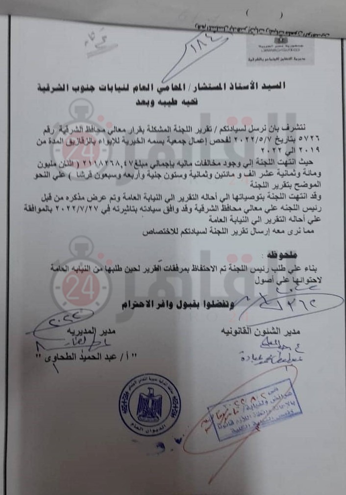 وحصل القاهرة 24، على مستند مقدم من عبدالحميد الطحاوي، وكيل وزارة التضامن الاجتماعي في محافظة الشرقية، بإحالة تقرير اللجنة المُشكّلة بقرار من الدكتور ممدوح غراب، محافظ الشرقية، رقم 5726 بتاريخ 7 مايو 2022، لفحص أعمال جمعية دار بسمة الخيرية للإيواء في الزقازيق بداية من عام 2019 وحتى 2022، إلى النيابة العامة.