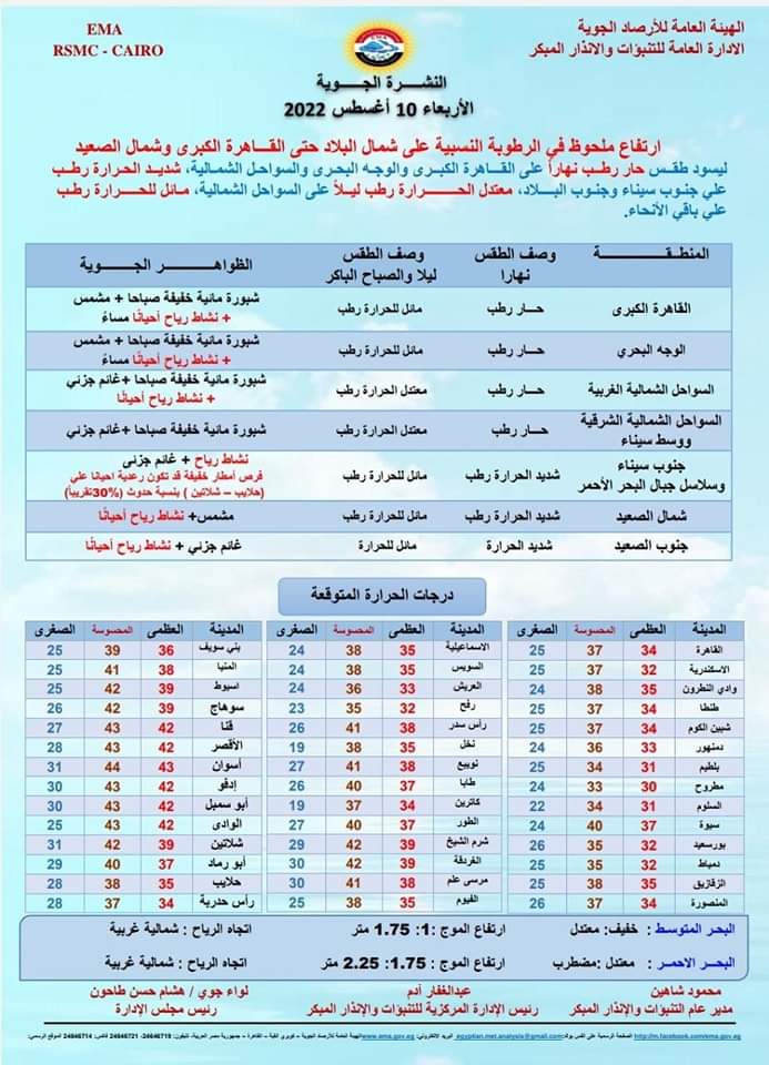 كشفت هيئة الأرصاد الجوية، حالة الطقس، اليوم الأربعاء، الموافق 10 أغسطس 2022، محذرة من ارتفاع نسبة الرطوبة على عدد من أنحاء الجمهورية.