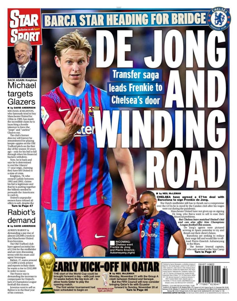 سلطت صحيفة ستار سبورت الضوء في غلافها على اقتراب الثنائي ممفيس ديباي وفرينكي دي يونج من الانتقال إلى نادي تشيلسي الإنجليزي في الميركاتو الصيفي الجاري، وخاصة أن برشلونة مُجبر على تسهيل رحيل بعض نجومه بسبب سقف الرواتب.