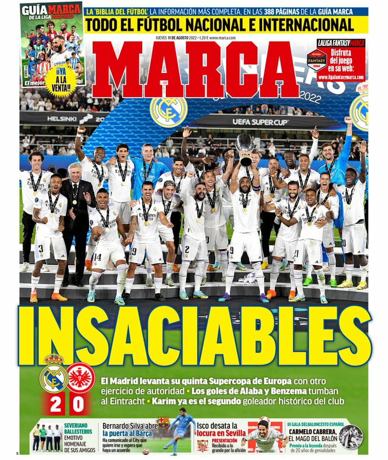 وتصدر فريق ريال مدريد غلاف صحيفة ماركا لعدد اليوم، وذلك مع العنوان: لا يشبع، وقالت الصحيفة إن ريال مدريد يرفع كأس السوبر الأوروبي للمرة الخامسة فى تاريخه.