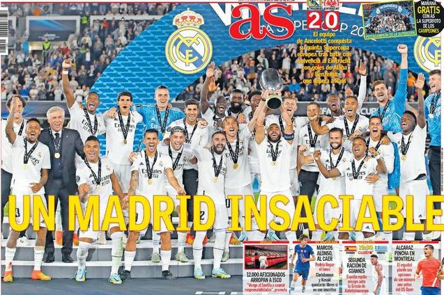 احتفلت صحيفة آس في غلافها اليوم بفوز ريال مدريد بلقب السوبر الأوروبي أمام انتراخت فرانكفورت، حيث عنونت بـ مدريد لا يشبع.