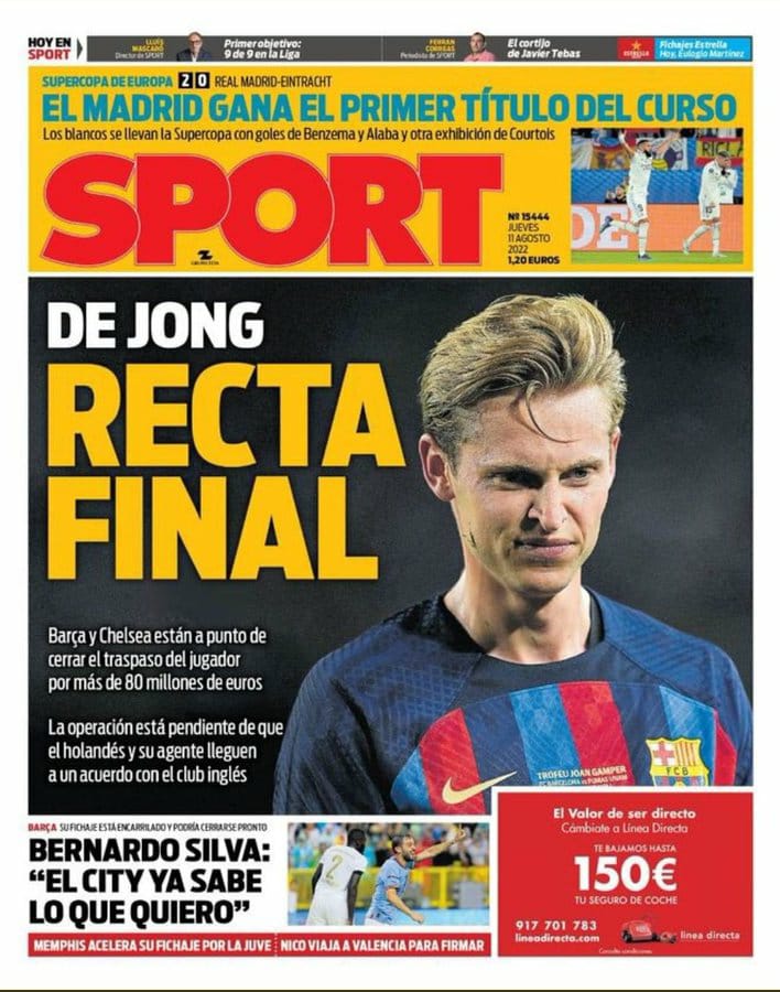 سلطت سبورت الضوء على رحيل فرينكي دي يونج لاعب برشلونة، حيث قالت في غلافها إن هناك اتفاقا وشيكا بين تشيلسي وبرشلونة بمبلغ أكثر من 80 مليون يورو، وأصبح كل شيء يعتمد على توصل تشيلسي إلى اتفاق مع وكيل فرينكي بشأن الشروط الشخصية.
