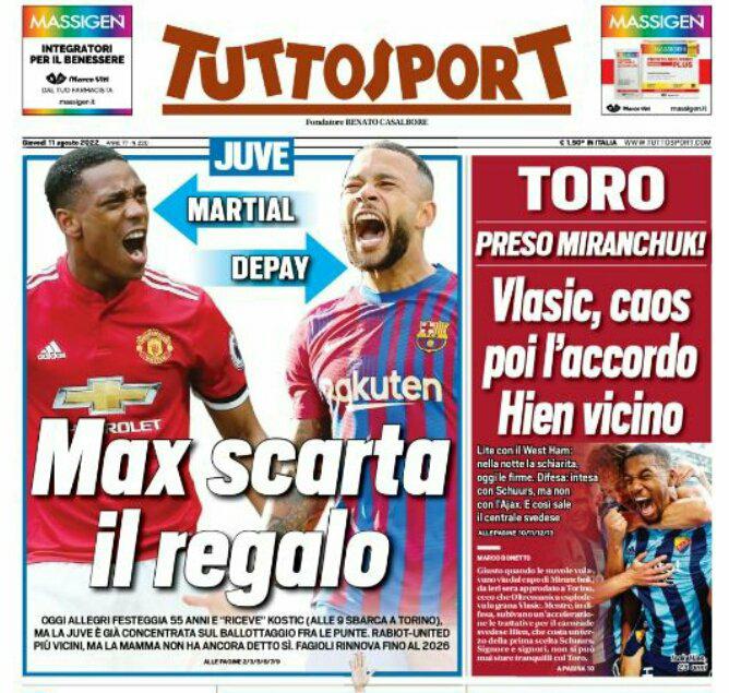 عنونت توتو سبورت في غلافها اليوم بـ أليجري يفتح الهدية.. مارسيال أو ديباي على رادار يوفنتوس، حيث أشارت الصحيفة إلى أن مدرب فريق السيدة العجوز يرغب في ضم صفقة هجومية خلال الفترة المقبلة بين الثنائي المذكور.