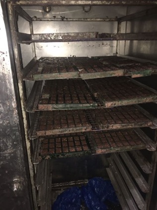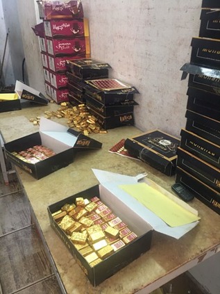 وعُثر بداخل المخزن على 730 كجم شوكولاتة، 100 كجم بديل زبدة، 350 كجم سكر، وأدوات التصنيع وجميعها مجهولة المصدر ودون مستندات تدل على مصدرها.