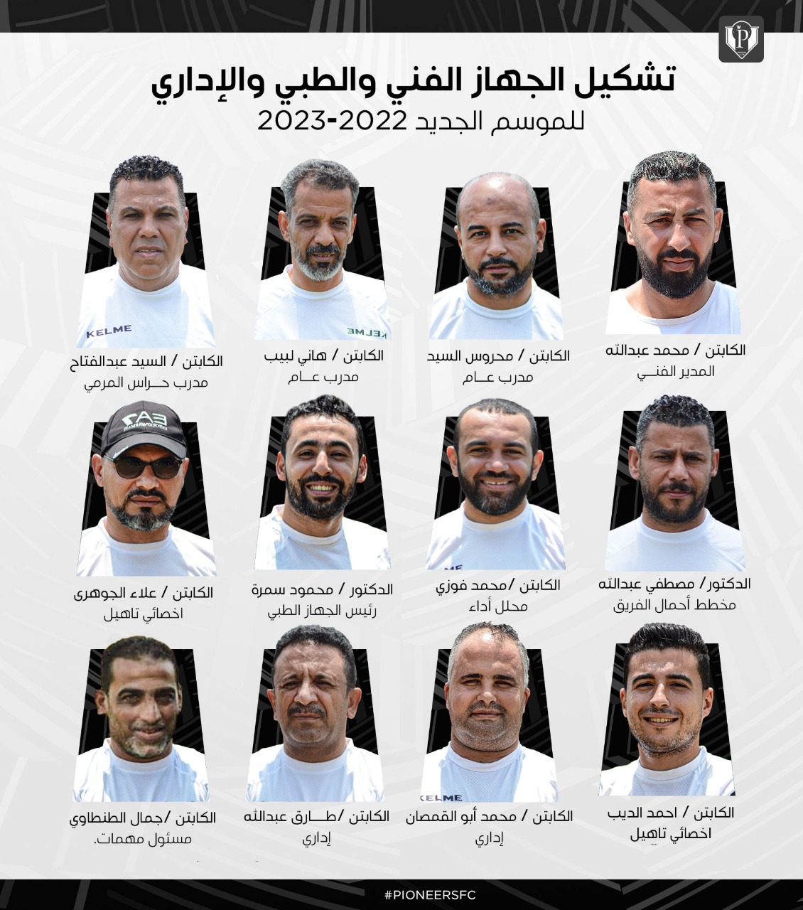 وجاء تشكيل الجهاز الفني للفريق بايونيرز للموسم الجديد كالتالي:- محمد عبد الله مديرًا فنيًا، محروس السيد مدربًا عامًا، هاني لبيب مدربًا، السيد عبد الفتاح مدربًا لحراس المرمى، مصطفى عبد الله مخطط أحمال الفريق.