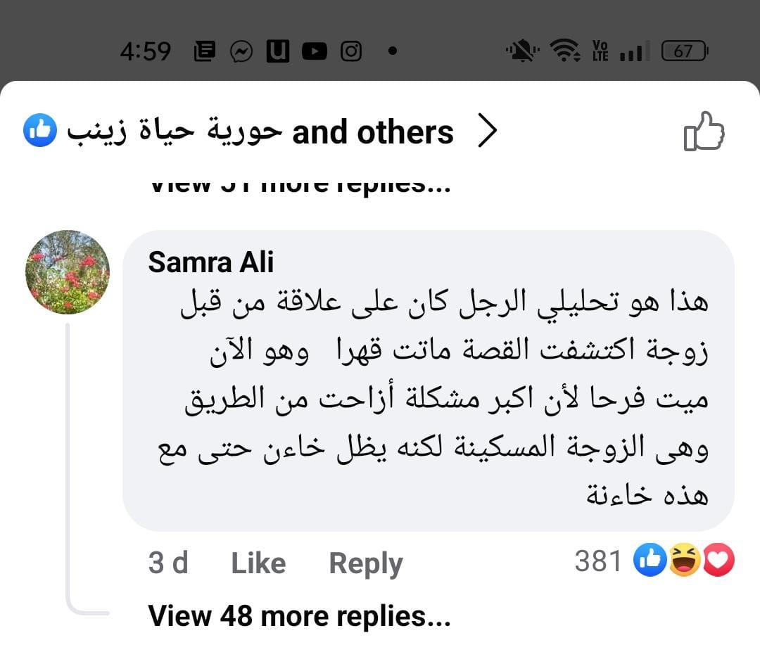وقال آخر: هذا هو تحليلي الرجل كان على علاقة من قبل، وزوجته اكتشفت القصة ماتت قهرا وهو الآن ميت فرحا، لأن أكبر مشكلة أزاحت من الطريق وهى الزوجة المسكينة لكنه يظل خائن.