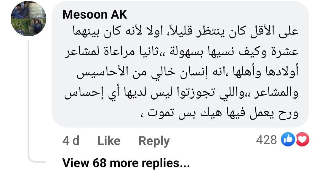 وعلق حساب باسم ميسون: على الأقل كان ينتظر قليلًا، أولا لأنه كان بينهما عشرة وكيف نسيها بسهولة، ثانيا مراعاة لمشاعر أولادها وأهلها، إنه إنسان خالي من الأحاسيس والمشاعر، واللي تجوزتوا ليس لديها أي إحساس ورح يعمل فيها هيك بس تموت.