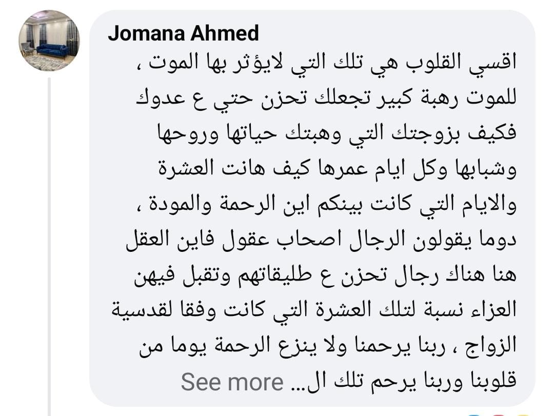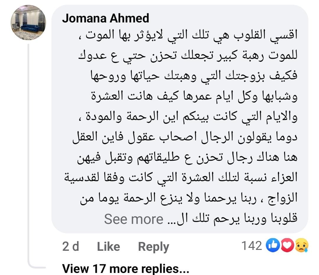 وكتب حساب باسم جومانا أحمد: أقسى القلوب هي تلك التي لايؤثر بها الموت، للموت رهبة كبير تجعلك تحزن حتى على عدوك، فكيف بزوجتك التي وهبتك حياتها وروحها وشبابها، وكل أيام عمرها كيف هانت العشرة والأيام التي كانت بينكم اين الرحمة والمودة.