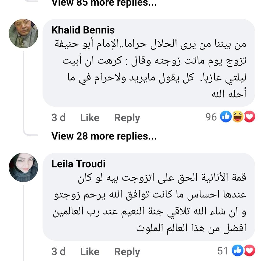 فيما علق آخر: يجب التحقيق في موت الزوجه كيف وجد زوجه بهذه السرعة إن لم يكن يعرفها من قبل، بينما كتب خالد: من بيننا من يرى الحلال حراما.. الإمام أبو حنيفة تزوج يوم ماتت زوجته وقال: كرهت أن أبيت ليلتي عازبا.. كل يقول مايريد ولاحرام في ما أحله الله.
