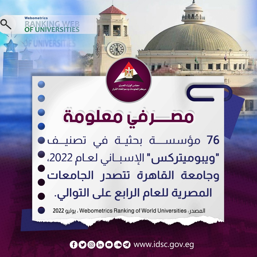 ورصد مركز المعلومات وجود 76 مؤسسة بحثية مصرية في تصنيف ويبوميتركس الإسباني لعام 2022، حيث تصدر جامعة القاهرة الجامعات المصرية للعام الرابع على التوالي، تلاها عدد كبير من الجامعات مثل: جامعة الإسكندرية، وجامعة المنصورة، وجامعة عين شمس.