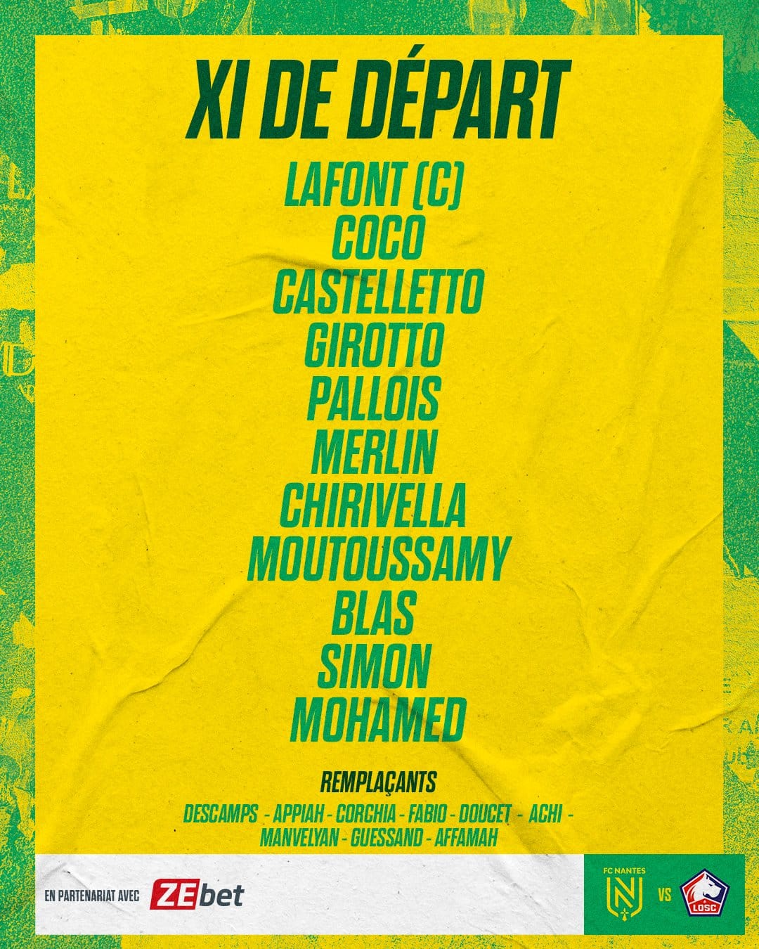أعلن المدرب أنطوان كومباريه، المدير الفني لفريق نانت، المحترف ضمن صفوفه لاعبنا الدولي مصطفى محمد، تشكيل فريقه الرسمي لمواجهة فريق ليل، ضمن منافسات مسابقة الدوري الفرنسي 2022-2023.