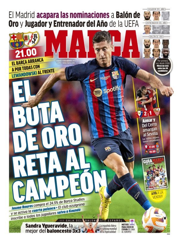 سلطت ماركا الضوء على تحدي البولندي روبرت ليفاندوفسكي لاعب برشلونة الجديد الذي سوف ينطلق اليوم مع أولى مباريات برشلونة، حيث عنونت بـ مهمة ليفاندوفسكي نحو الحذاء الذهبي.