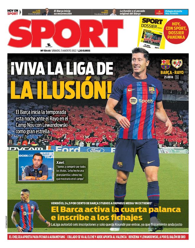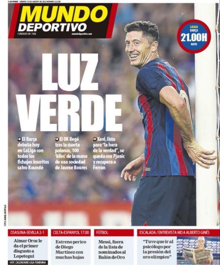تصدر ليفاندوفسكي غلاف موندو ديبورتيفو بعد تسجيله لاعبا رسميًا في برشلونة أمس، وكتبت الصحيفة الضوء الأخضر، وقالت إن برشلونة سجل جميع التعاقدات باستثناء كوندي.