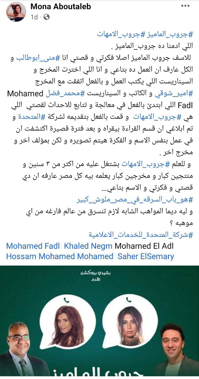 ونشرت منى أبو طالب عبر حسابها الشخصي بـ فيسبوك: للأسف جروب الماميز أصلا فكرتي وقصتي.. أنا منى أبو طالب والكل عارف إن العمل ده بتاعي وأنا اللي اخترت المخرج والسيناريست اللي يكتب العمل.